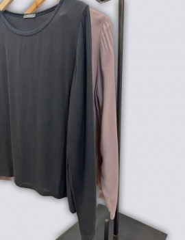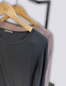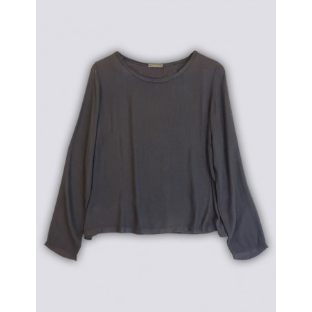 BLUSA VARIETY MODELLO TABA REALIZZATA IN 100% RYON COLORE GRAFITE DALLA MANO CALDA E CONFORTEVOLE .DAL FIT MORBIDO ,LA MANICA LUNGA E LO SCOLLO TONDO E AMPIO LO RENDONO UN CAPO PERFETTO DA INDOSSARE DA SOLO O SOTTO UN BLAZER O UN CARDIGAN PER UN LAYERING SOFISTICATO.