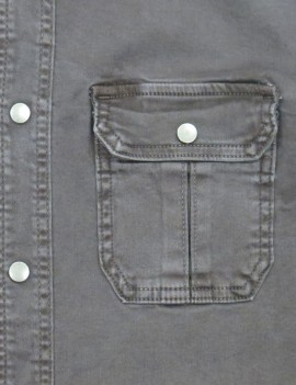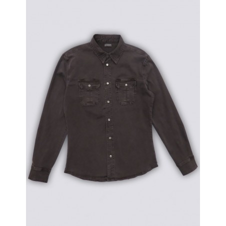 CAMICIA MODELLO FOSTER DI ORIGINS&CO, A MANICA LUNGA DAL FIT SLIM, REALIZZATA IN COTONE ELASTICIZZATO, TINTO CAPO CON LAVAGGIO ENZIMATICO COLORE MORO . UN EVERGREEN DEL GUARDAROBA MASCHILE CON UN LOOK MILITARY