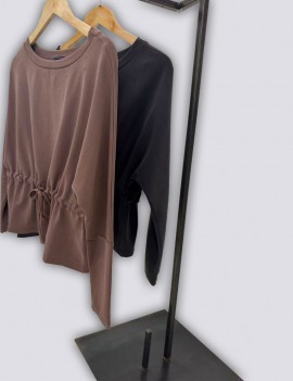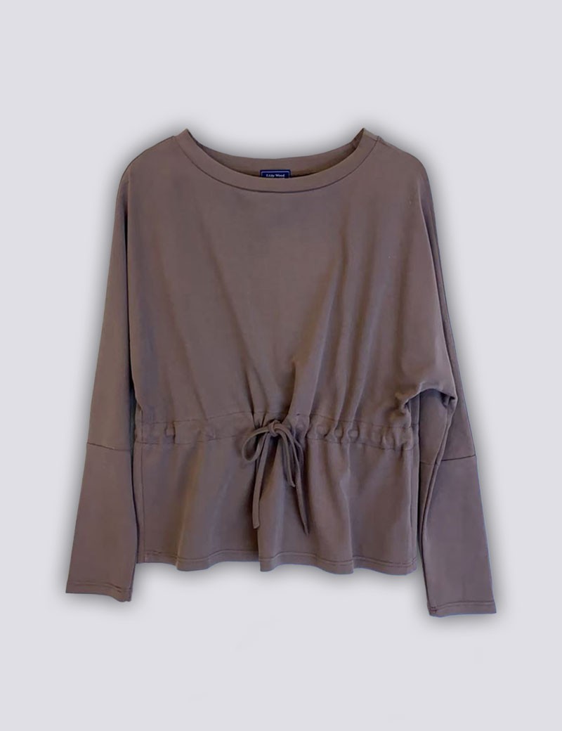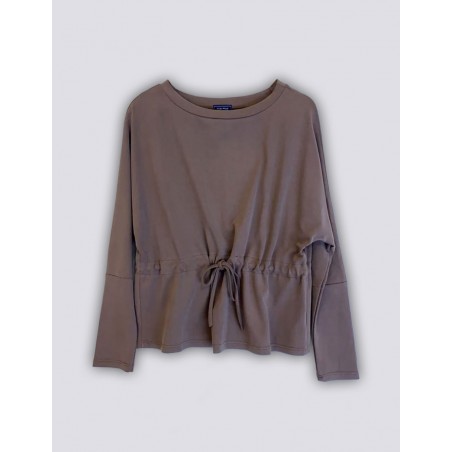 FELPA EDDY WOOD MODELLO ALJES REALIZZATA IN PUNTO MILANO DI MISTO MODAL E VISCOSA COLORE MALTO , IL DESIGN CON IL POLSO ALTO E STRETTO , LA COULISSE CHE DRAPPEGGIA IL CORPO E LO SCOLLO A BARCHETTA AGGIUNGONO UN TOCCO SENSUALE E SOFISTICATO AL CAPO, ABBINATO AL PANTALONE ELEVE PER UN LOOK COMFORT CHIC.