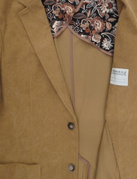 BLAZER ORIGINS&CO MODELLO LAKIS REALIZZATO IN MORBIDO VELLUTO A COSTE COLOR CAMMELLO , MONOPETTO CON BOTTONI A QUATTRO FORI IN FINTO CORNO , DETTAGLI IN RASO IN COLORE DI CONTRASTO , MANTELLINA INTERNA E TASCHINO SU CUORE CON FAZZOLETTO MOTIVO FLOREALE, TASCHE FRONTALI APPLICATE. UN BLAZER DAI DETTAGLI CURATISSIMI DA ABBINARE AL TUO JEANS PREFERITO PER UNO STILE CASUAL RICERCATO.