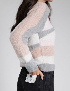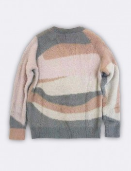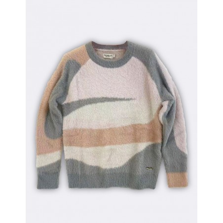 PULL FRED MELLO 100%POLIAMMIDICA CON LAVORAZIONE A INTARSIO SUI TONI DEL ROSA , GRIGIO E CAMMELLO , EFFETTO PELUCHE PER UN EFFETTO SOFT , UN CAPO PERFETTO ABBINATO AL DENIM.