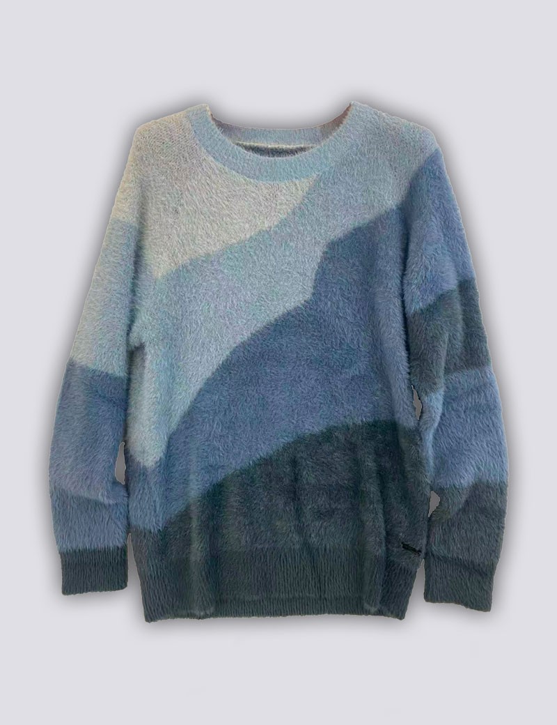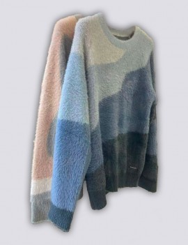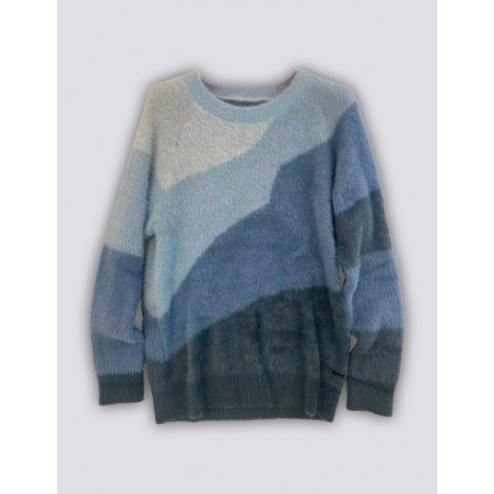 PULL FRED MELLO 100%POLIAMMIDICA CON LAVORAZIONE A INTARSIO SUI TONI DEL CIELO, BLU E PANNA , EFFETTO PELUCHE PER UN EFFETTO SOFT , UN CAPO PERFETTO ABBINATO AL DENIM.