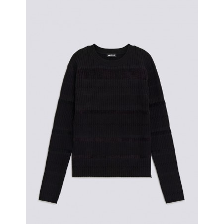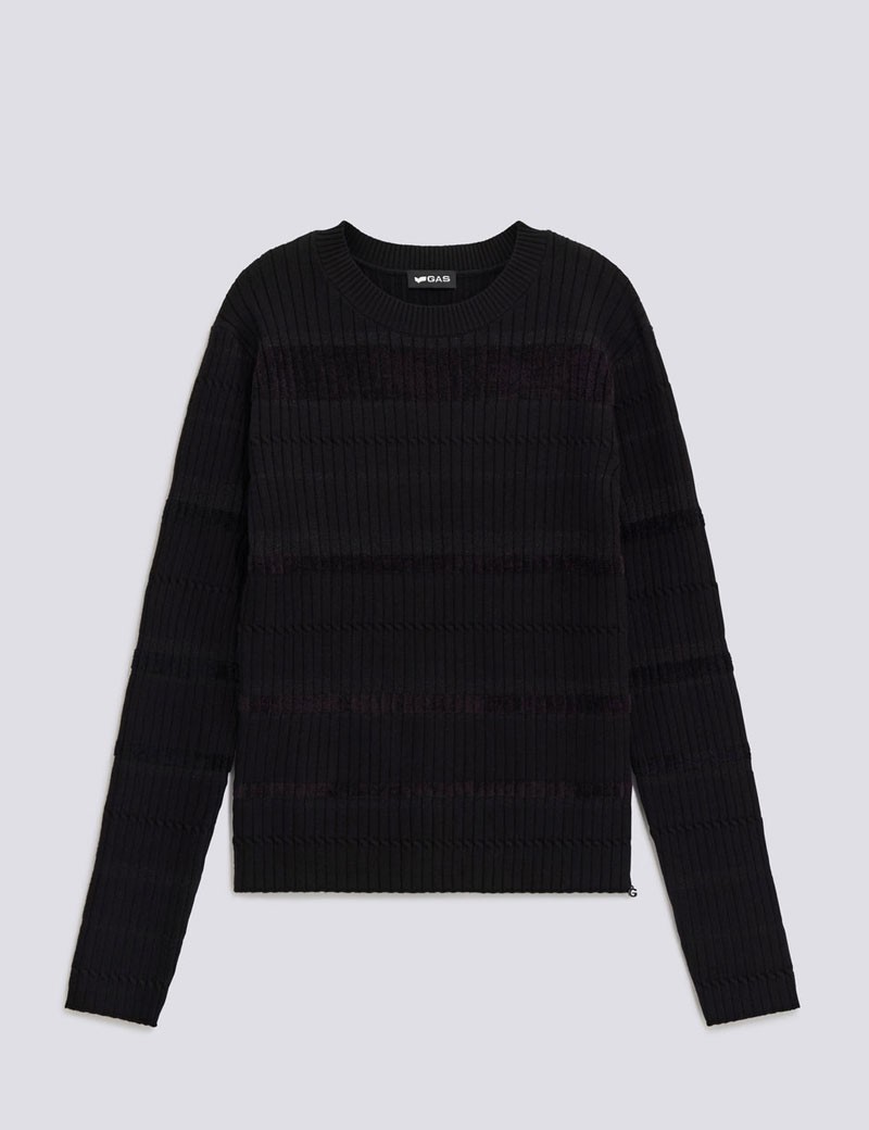 PULL GAS MODELLO GARANCE GIROCOLLO SLIM FIT IN FILATO MISTO VISCOSA FINEZZA 12, DALLA MANO MORBIDA. LA LAVORAZIONE A COSTE CON RIGHE ORIZZONTALI ARRICCHITE DA INSERTI LUREX DONA UN TOCCO SHINY E CONTEMPORANEO. DETTAGLI ICONICI COME LA PLACCA LOGO IN METALLO SUL RETRO E IL PENDENTE 'G' SUL FIANCO LO RENDONO UN ELEVATED ESSENTIAL PERFETTO PER L'INVERNO.