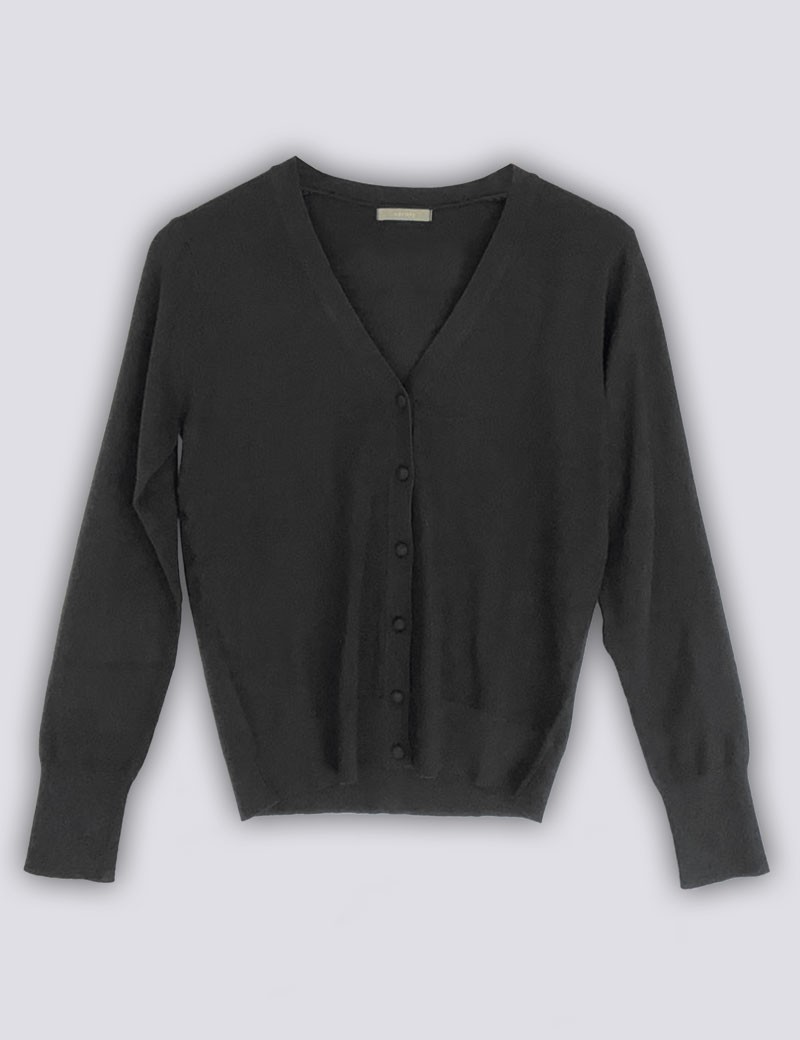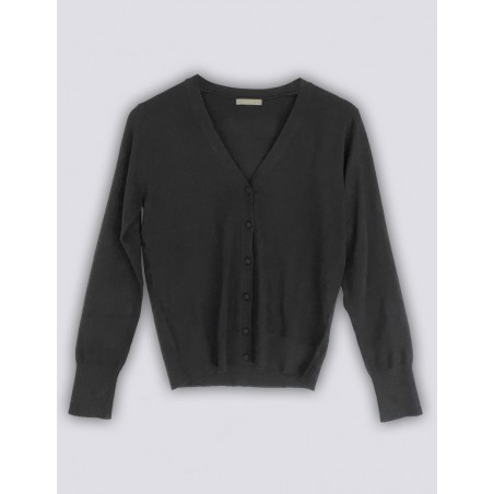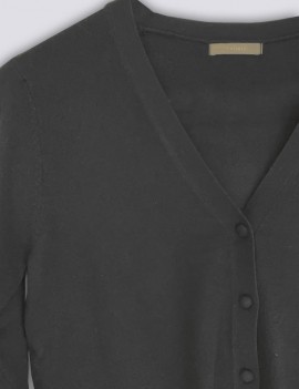 CARDIGAN VARIETY MODELLO VERIN REALIZZATO IN MAGLIA DI MISTO VISCOSA FINEZZA 12 COLORE NERO CON SCOLLO A V E BOTTONCINI FODERATI . UN CAPO ESSENZIALE PER TUTTI I GIORNI , PERFETTO PER CHI CERCA COMFORT. IL DESIGN E I DETTAGLI ESALTANO LA SILHOUETTE.