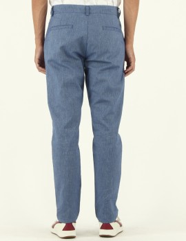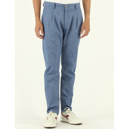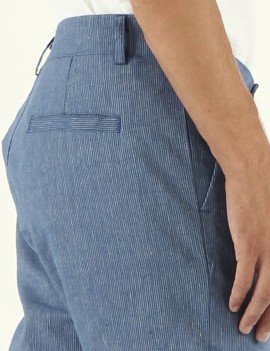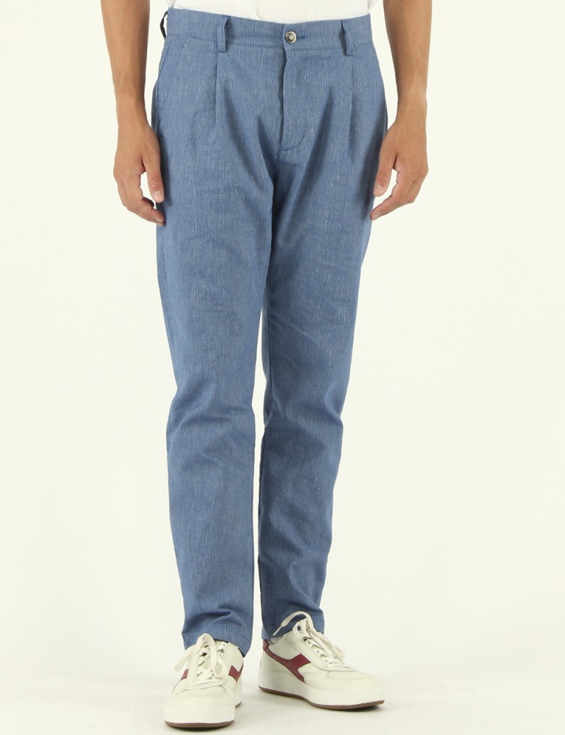 PANTALONE MODELLO NOLTE IN TELA DI COTONE TRAMA RIGATA COLOR AVIO ,TASCHE ALLA FRANCESE SUI FIANCHI , PINCES FRONTALI, TASCHE A FILETTO POSTERIORI , CHUSURA CON PATTA CON ZIP E BOTTONE IN FINTO CORNO