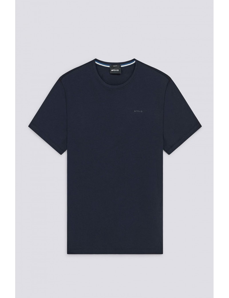 T-SHIRT GAS MODELLO A MANICA CORTA DAL FIT SLIM , REALIZZATA IN JERSEY STRETCH COLORE BLU. LA STAMPA LOGO SPESSORATA E IL PARASUDORE LOGATO FIRMANO UNO STILE ESSENZIALE MA COOL