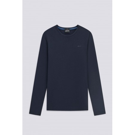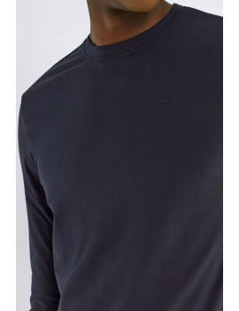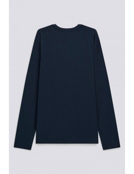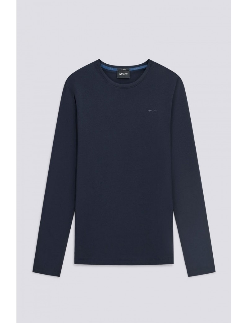 T-SHIRT GAS MODELLO JANIS A MANICA LUNGA SLIM FIT REALIZZATA IN JERSEY STRETCH COLORE BLU, VALORIZZATA DALLA STAMPA LOGO SPESSORATA TONO SU TONO SUL PETTO SINISTRO E DAL PARASUDORE INTERNO LOGATO, PER UN TOCCO DISTINTIVO E CONTEMPORANEO