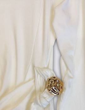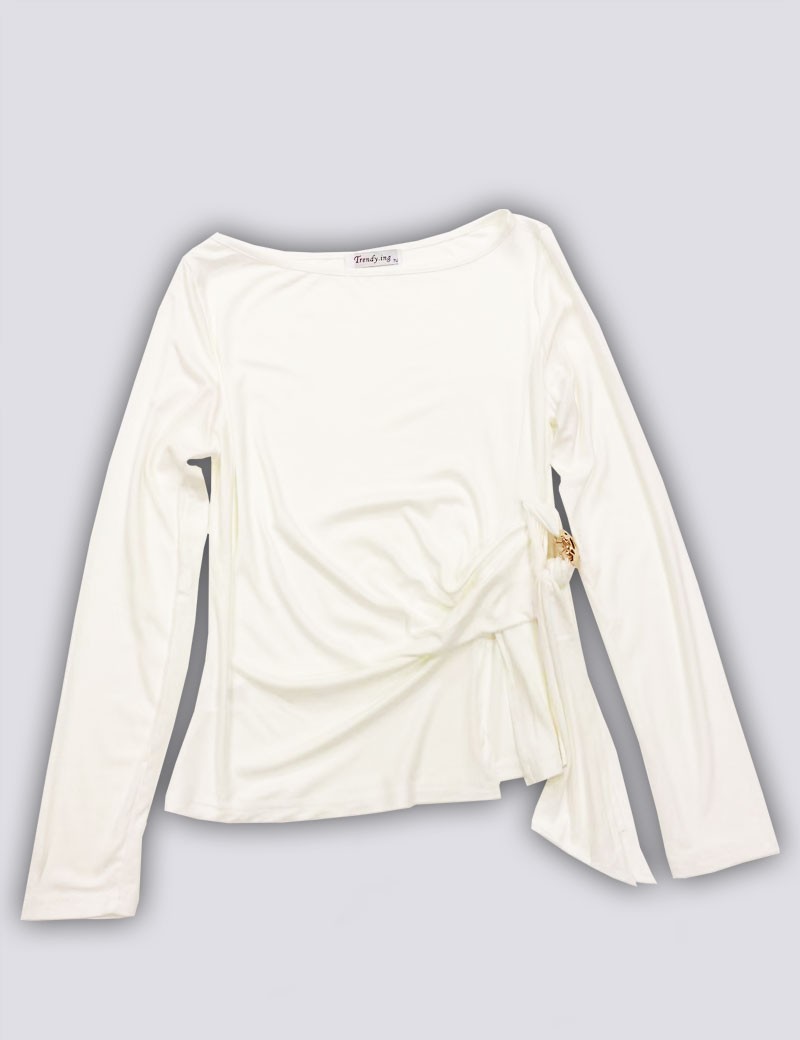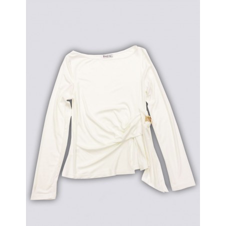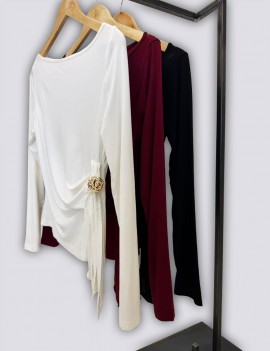 T-SHIRT MODELLO 3871 RAFFINATA E FEMMINILE, QUESTA MAGLIA BIANCA È IL CAPO IDEALE PER AGGIUNGERE UN TOCCO ELEGANTE AI TUOI LOOK QUOTIDIANI. REALIZZATA IN UN TESSUTO MORBIDO ED ELASTICO DI MISTO VISCOSA, VALORIZZA LA FIGURA GRAZIE AL DRAPPEGGIO LATERALE CON NODO E DETTAGLIO GIOIELLO DORATO, CHE DONA LUMINOSITÀ E STILE. LO SCOLLO LEGGERMENTE A BARCA E LE MANICHE LUNGHE COMPLETANO IL DESIGN PULITO E SOFISTICATO, PERFETTO DA ABBINARE SIA A PANTALONI ELEGANTI CHE A JEANS PER UN OUTFIT CHIC E VERSATILE.