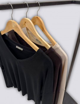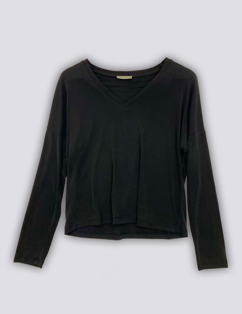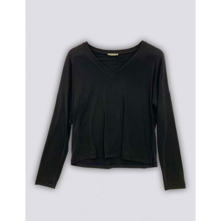T-SHIRT VARIETY MODELLO IADES REALIZZATA IN MORBIDA COSTINA DI VISCOSA COLORE NERO, DAL FIT COMFORT , LO SCOLLO A V E LE MANICHE LUNGHE SCIESE LO RENDONO UN CAPO DAL TWIST FEMMINILE E DECISO.